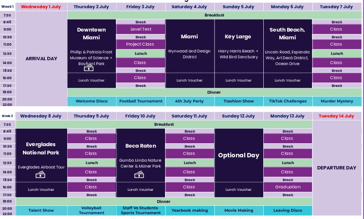 • Uczestnicy letniego pobytu będą mieli nie tylko możliwość nauki języka ale również odkryją tętniącew życiem dzielnice Miami, takie jak Wynwood, South Beach i Downtown, a także uczestnicząc w ekscytujących wycieczkach do Florida Keys i Everglades National Park.